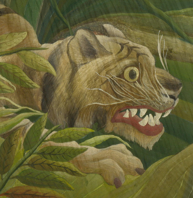 Por exemplo neste quadro naïf de Henri Rousseau (dit le Douanier) intitulado “Surpris” em que vemos um tigre surpreendido por um relâmpago numa selva debaixo duma tempestade com muita chuva e vento, que fui buscar ao site da National Gallery, aqui.