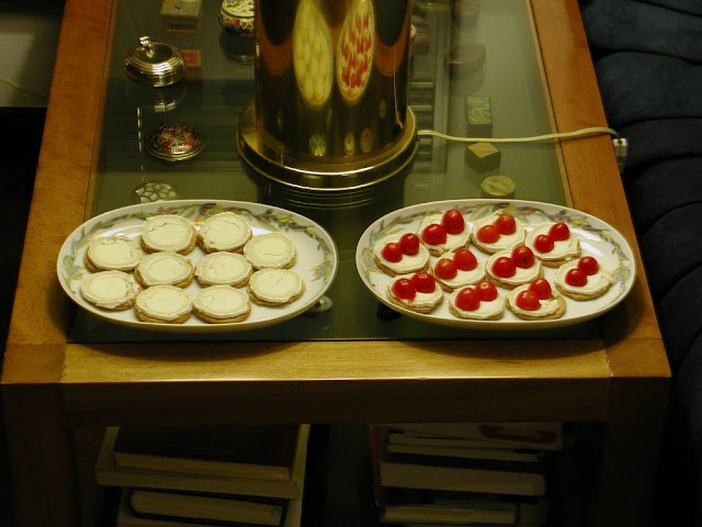 No prato seguinte passei a colocar apenas uma calote de tomate cereja em cada rodela de queijo cabra, fazendo lembrar visualmente um ovo estrelado (com gema vermelha). Os canapés verdes são "sandes" assimétricas com uma tosta, uma pasta de atum com muito pouca maionese e uma rodela de pepino a fazer de outra "tosta", donde o nome de sandes assimétrica.