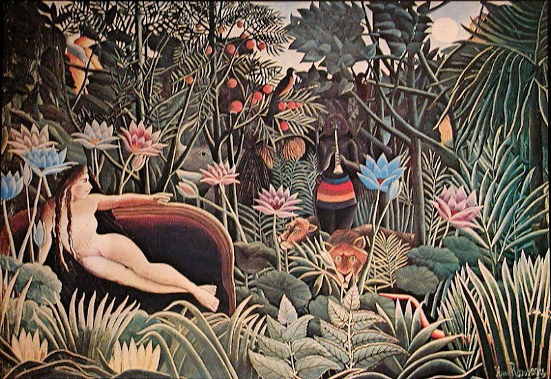 Sempre gostei muito deste quadro "naif", com a sua colecção improvável de plantas, animais, uma mulher nua no que parece uma espécie de sofá e mesmo um tocador de flauta!