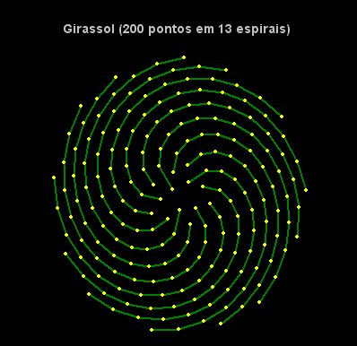 Isto mostra que à medida que aumenta o número de pontos da nuvem começam a ser visíveis um maior número de espirais. Faço notar que, por exemplo, as 34 espirais visíveis na nuvem de 200 pontos são praticamente invisíveis na nuvem de 100 pontos pois neste caso cada uma delas tem apenas 3 pontos.