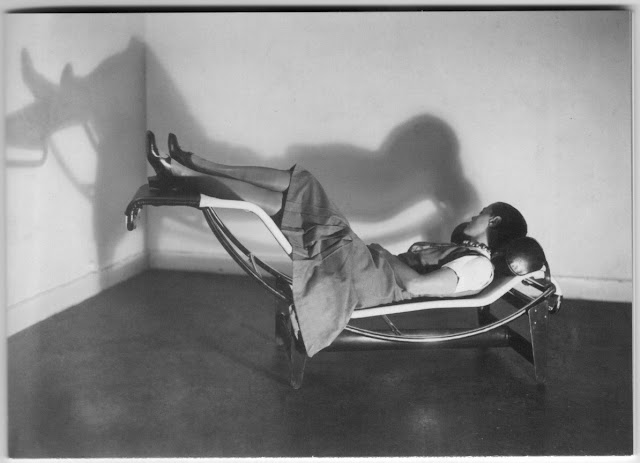 Estou satisfeitíssimo quer com a forma ergonómica, quer com a possibilidade de variação, de modo contínuo, da posição da cadeira, que pode estar mais elevada para ler ou ver televisão, ou mais baixa para uma posição de maior repouso, facilitando a circulação nas pernas, como nesta imagem em que posa a referida Charlotte Perriand (será?) (adenda: é).